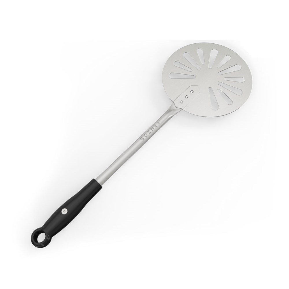 After using the Roccbox Pizza Peel to place fresh pizza inside Roccbox, utilise the Roccbox Turning Peel to slide and turn the pizza simply and easily whilst cooking. Incorporating a slimline, circular surface, the peel fits easily beneath a partially cooked dough base, enabling the gentle turning or manoeuvring of baked goods within the oven.